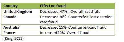 EMV technology has been successful at reducing fraud in various countries. It is estimated that the total amount of savings in the United States will be $700 million annually from counterfeit fraud and $300-$350 million annually from lost/stolen card fraud (Group, 2014). Below are some statics on the impact of EMV in various countries: